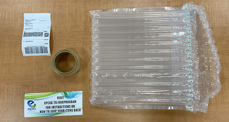 Upon receiving the requested custom box, please inspect its contents. Along with the box, you should receive a roll of tape, one bubble pack, printed return options, and a return shipping label.